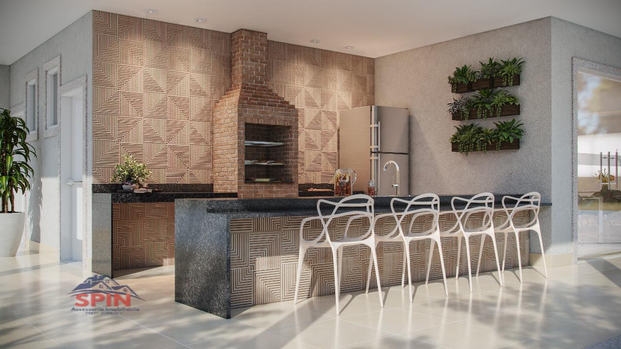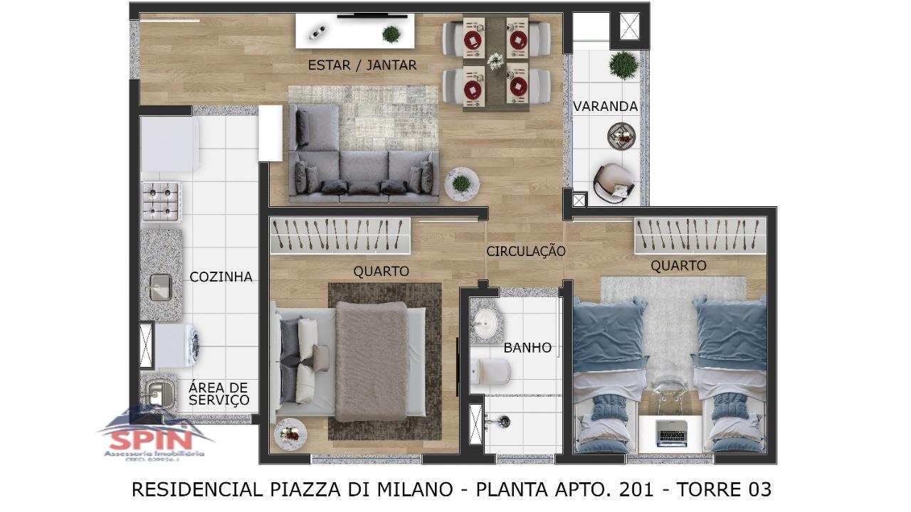Cozinha e área de serviço entregue com piso cerâmico, bancada em mármore sintético e azulejo até o teto, no banheiro com azulejo até o teto, piso cerâmico e bancada em mármore sintético e sala e quarto com piso laminado.